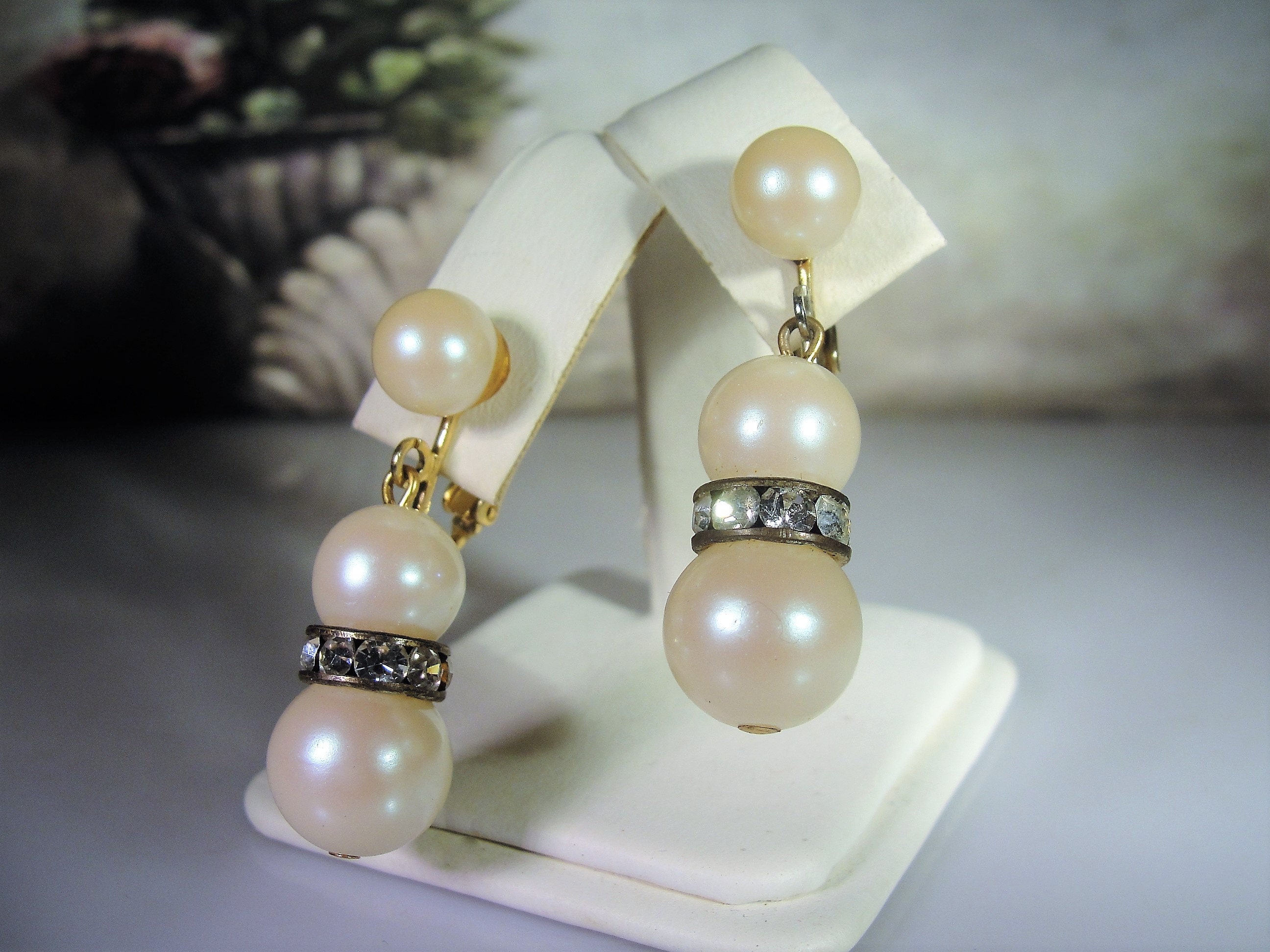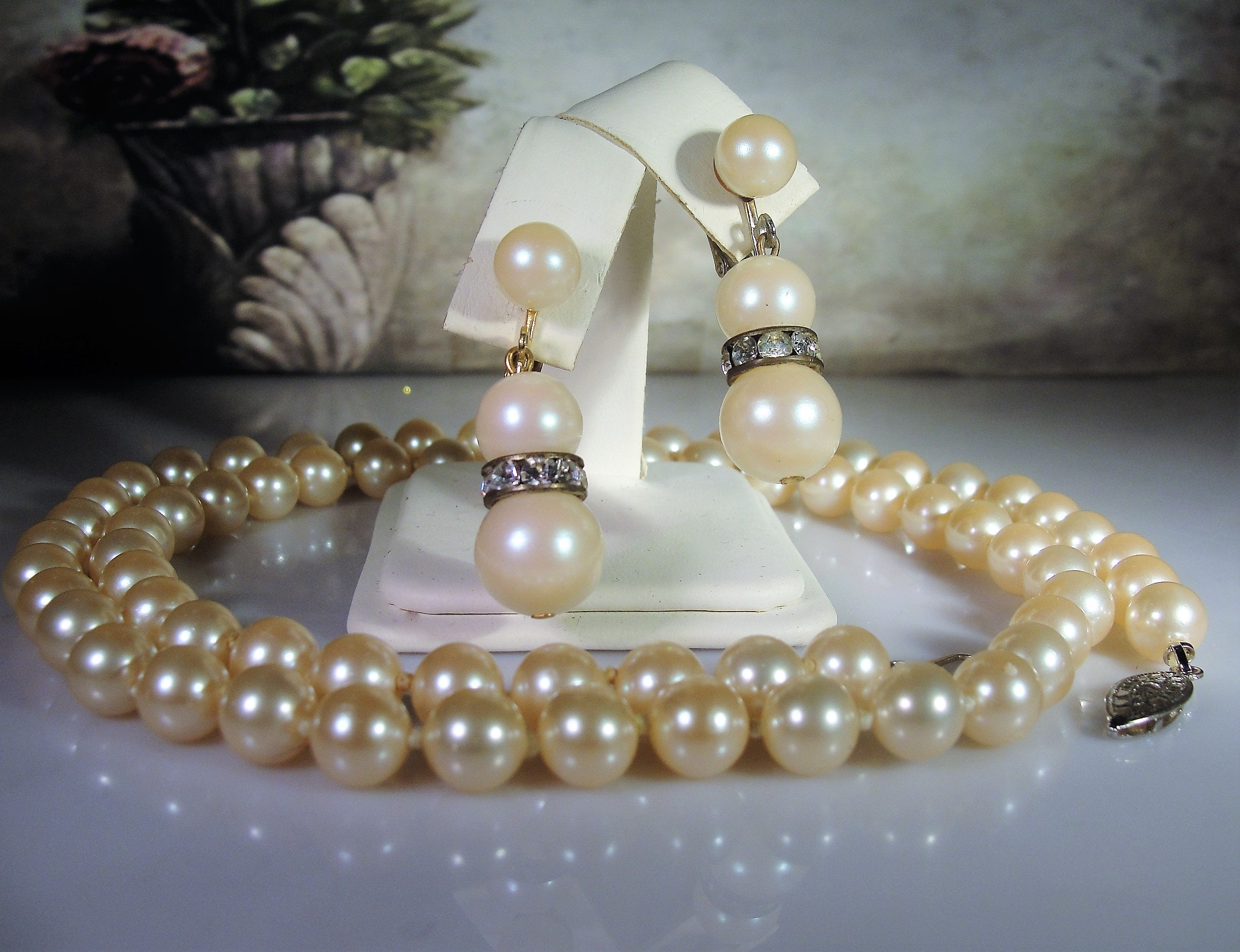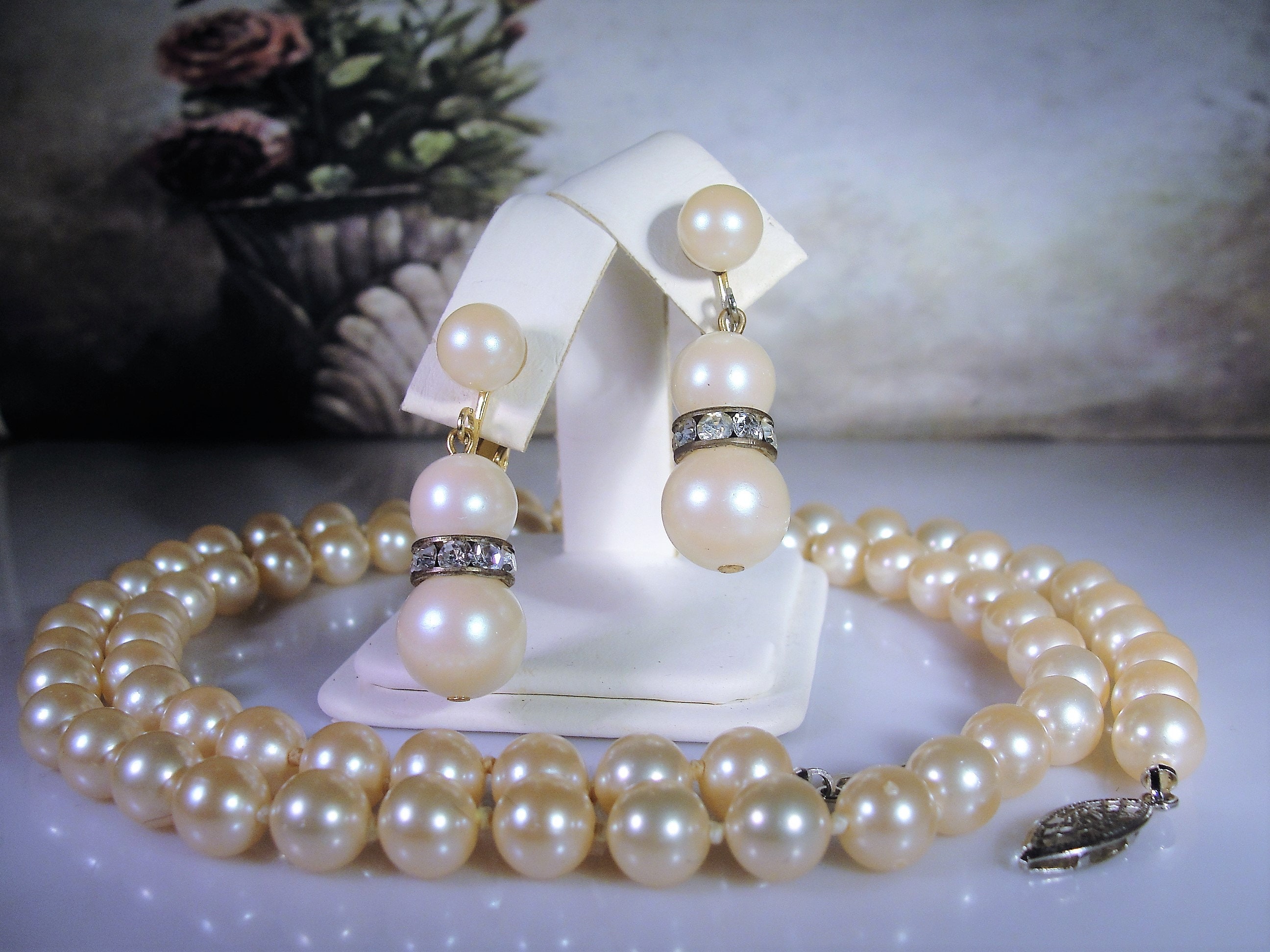 Jewelry Set, Pearl Necklace and Earrings, 30" String of Pearls, Screw Back Pearl & Rhinestone Earrings, Vintage Jewelry Set