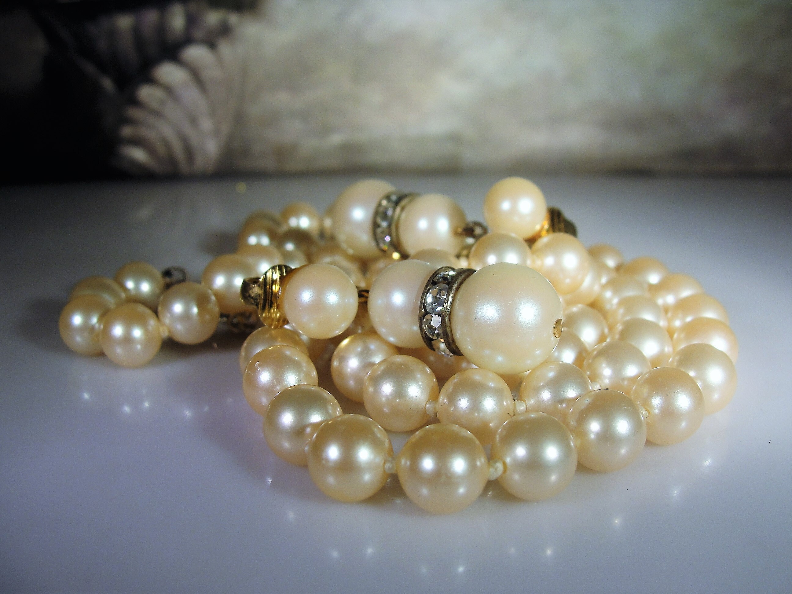 This is a lovely 24 inch string of faux pearls that are slightly graduated and a matching pair of screw back earrings that have rhinestone accents. Both of these pieces are from the same era. Circa 1950s with the golden color that only happens with age.