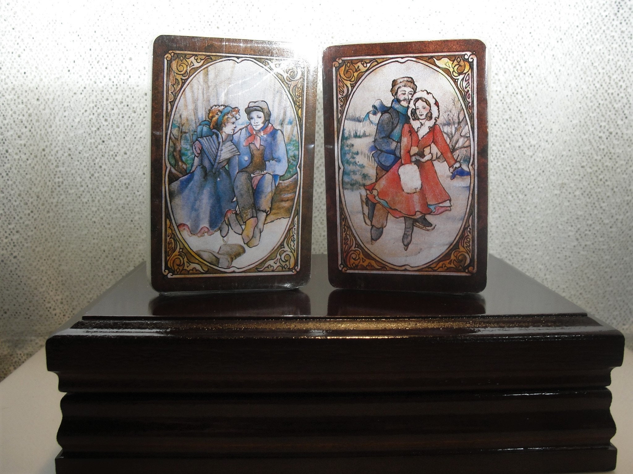 For those days when we feel like shut-ins, but need to stay safe, break out this nice set of playing cards that could be fun for the entire family. Beautiful wooden case with a hinged door and an insert that has two slots where two unused decks of cards reside. The cards have a vintage theme and are still sealed in their original cellophane wrapper! Fun for the whole family!