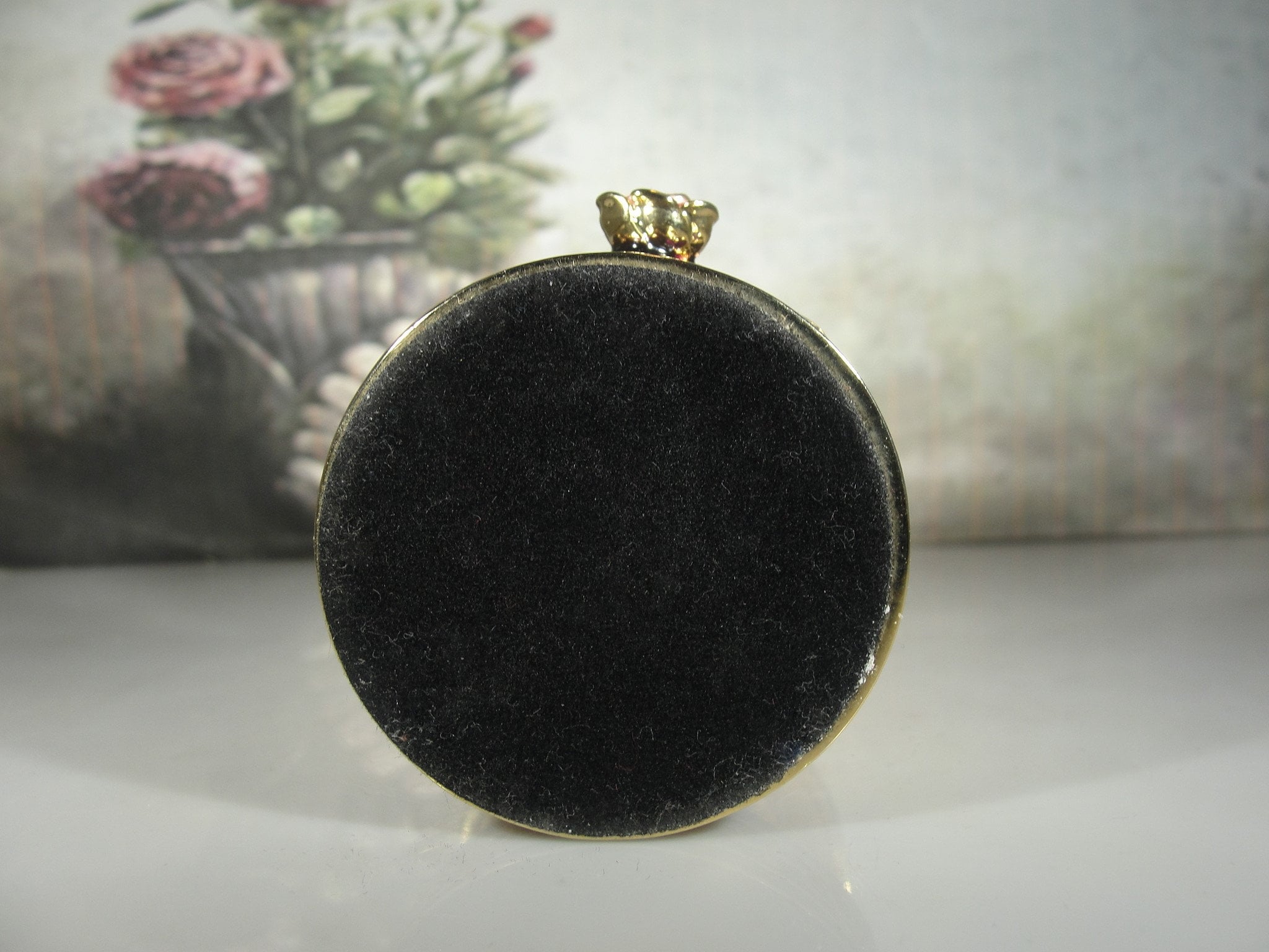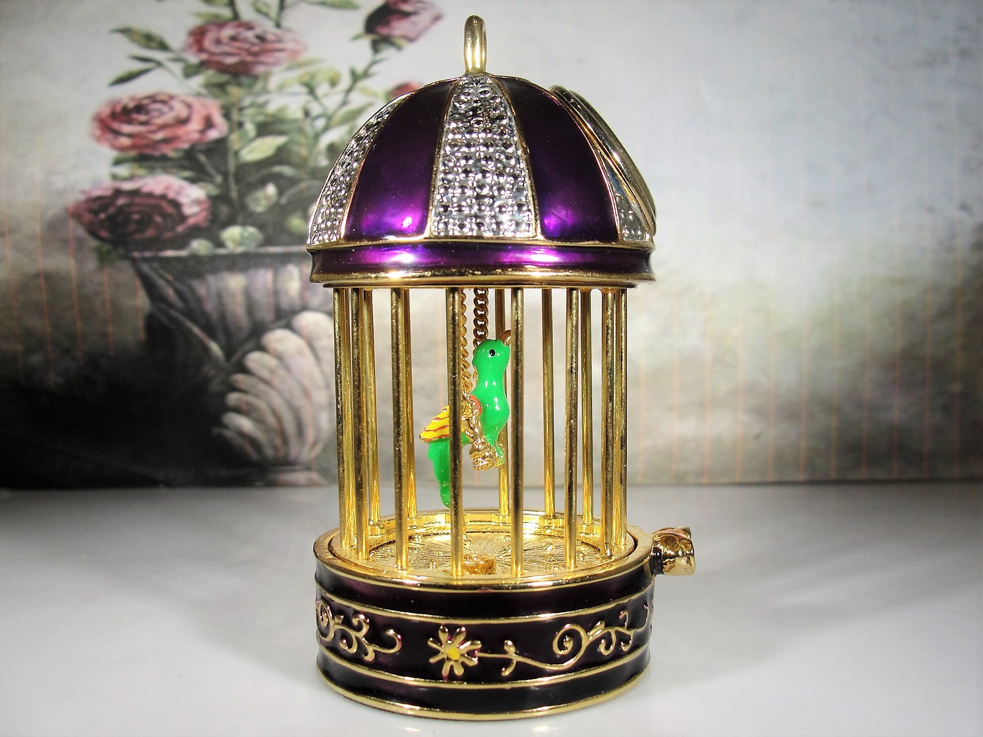 This is a miniature purple enamel and rhinestone birdcage clock that has a little green, yellow and orange parakeet that swings on a swing in the center of the cage. The enamel and detail work is wonderful. This clock can stand on its own or if you have a hook and want to hang from the hook, you can very easily do that because of the eye at the top of the cage. Simply slide the hook into it. This clock has gold gilt throughout and it is just a beautiful collector’s piece!